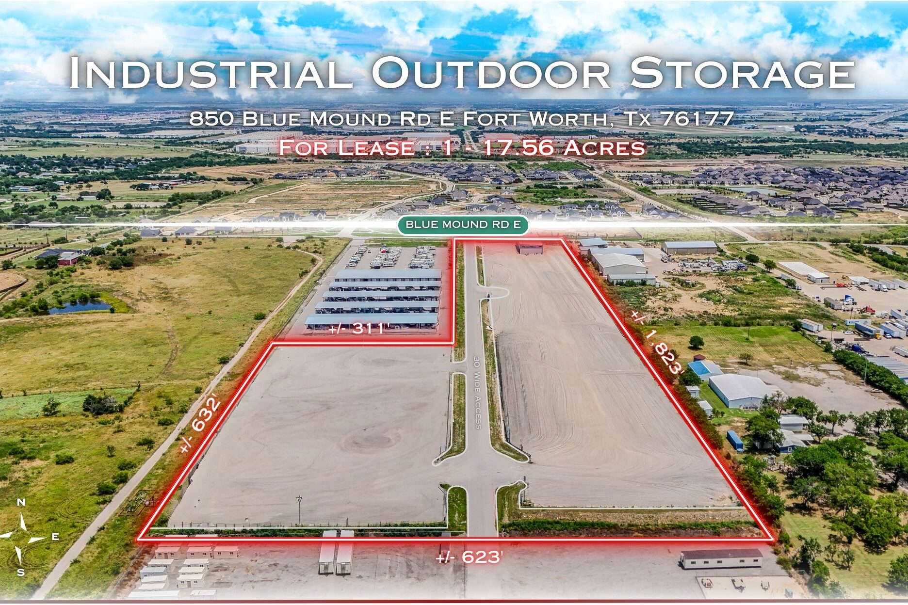 850 Blue Mound Rd E in Haslet, TX offers ±17.56 acres of fully fenced, heavy-duty stabilized yard with 6″-8″ flex base, ideal for truck and trailer parking, container storage, or material laydown. .
